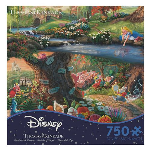 Thomas kinkade disney collection is a group of paintings inspired by great moments from famous walt disney movies this 750 piece puzzle features alice in wonderland looking at her reflection in a pond.